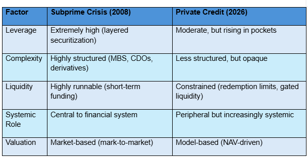 This reconfiguration of risk can be further understood by comparing the structural characteristics of private credit with those of the subprime mortgage market prior to the 2008 financial crisis.
