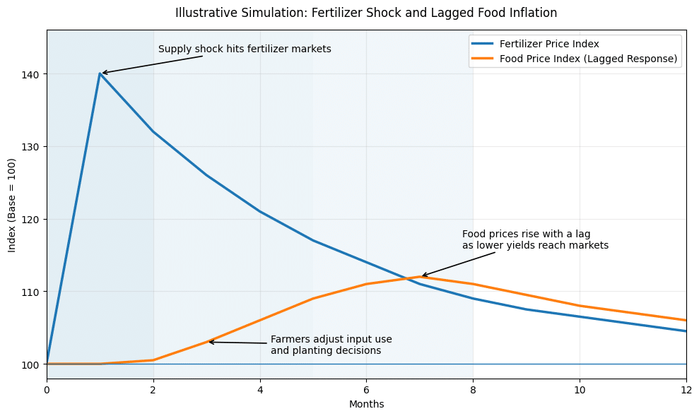 | A simplified simulation of recent fertilizer shocks reveals a consistent and empirically supported pattern. When fertilizer prices increase sharply — around 20–40% or more — the immediate effect is observed in farmer behavior rather than food prices. Farmers respond within weeks by reducing application rates, delaying purchases or shifting toward less fertilizer-intensive crops. Food prices initially remain stable due to inventories and production lags, but begin to rise after several months, consistent with observed farm-to-retail transmission delays of 1–6 months. The resulting food price increase is smaller in magnitude — typically in the range of 5–10% — but more persistent, reflecting partial pass-through and ongoing production cost pressures. |