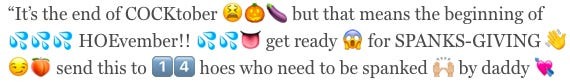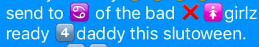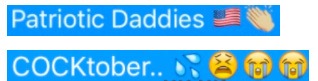 We also notice that in these emoji chain texts, the short, common words without really concrete meanings (like “is” or “to”) are not followed by emoji determinatives, whereas nouns like “Patriotic Daddies” and “COCKtober” are followed by one or two determinatives indicating their meaning or associations in the context of the sentence.