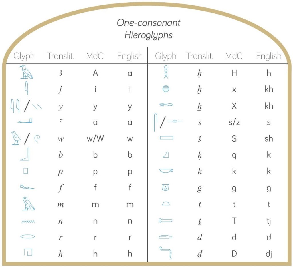 The Middle Egyptian Alphabet, from https://tetisheri.co.uk/egyptian-transliteration-mdc/