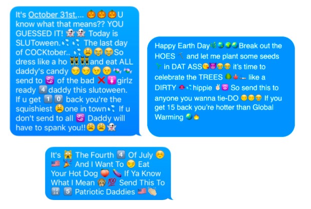Generally, these emoji-filled exhortations are text messages, usually wishing you a happy holiday, promising you sex if you forward it to another person and cursing you with a lack of sex if it isn’t forwarded. These messages are usually littered with ham-fisted sex puns.