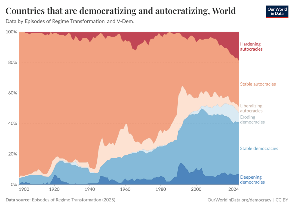 Others claim that the erosion of democracy is overstated, or even illusory. Revisionist scholars argue that claims of global backsliding reflect coding bias, not reality. It’s true that when the data is aggregated and viewed over a century, it is actually autocracies that have lost the greatest market share.