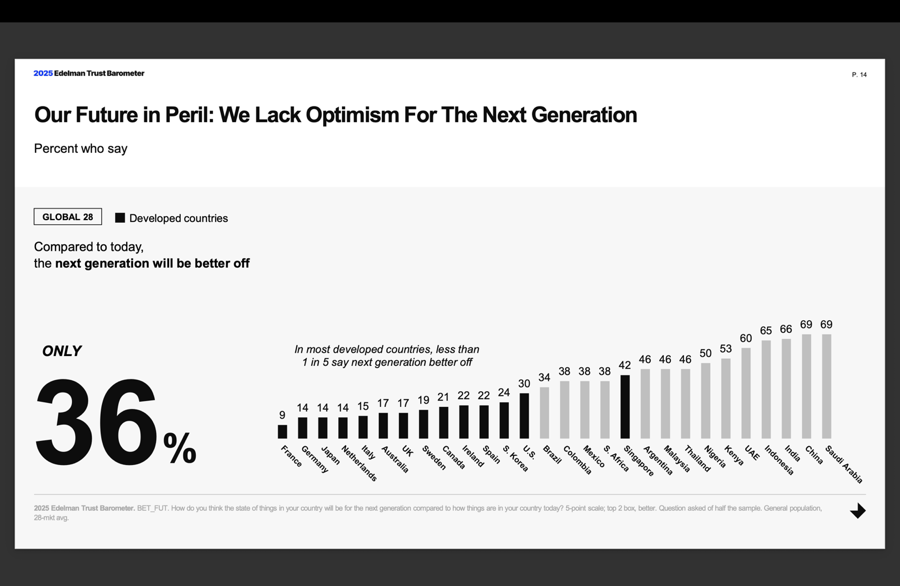 The Trust Barometer also offers a possible explanation for why the “kids aren’t alright” — a collapse in optimism. Democratic and developed societies no longer believe that the next generation will be better off. This sentiment appears irrespective of geography, but correlates strongly with governing ideology. The most pessimistic countries include democracies like France (9% affirmative response) and Japan (14%), while China and Saudi Arabia were tied for most optimistic, with 69% answering affirmatively.